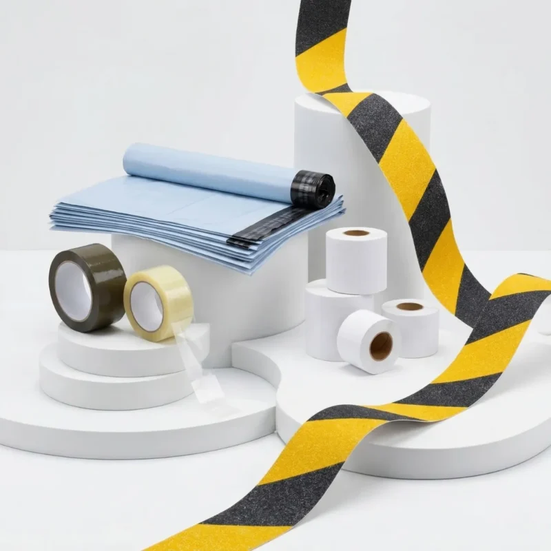 - Taśmy pakowe – trwałe i wytrzymałe, idealne do zabezpieczania przesyłek.