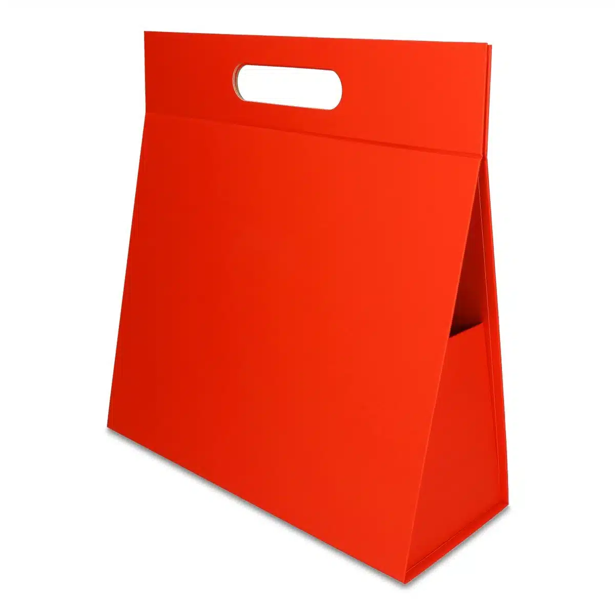 Nowoczesne pudełko prezentowe w kształcie trójkąta, z praktycznym uchwytem do przenoszenia. Intensywny czerwony kolor nadaje prezentowi efektowny wygląd i wzmacnia pierwsze wrażenie przy wręczaniu. Wykończenie Silk Touch zapewnia elegancki, uporządkowany charakter opakowania.