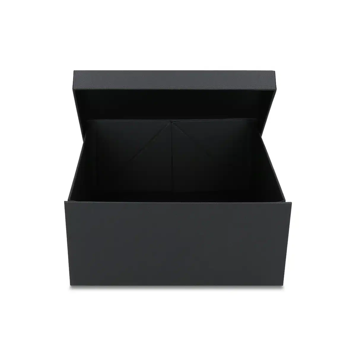 Pudełko Easy Box Plus składa się z solidnej składanej podstawy oraz gotowego wieczka. Oba elementy wykonane z materiałów premium doskonale się uzupełniają, tworząc estetyczną całość. Składana podstawa wzbogacona o elementy samoprzylepne marki 3M zapewnia trwałość i łatwość użytkowania, a wieczko w czarnym macie nadaje opakowaniu luksusowego wyglądu.