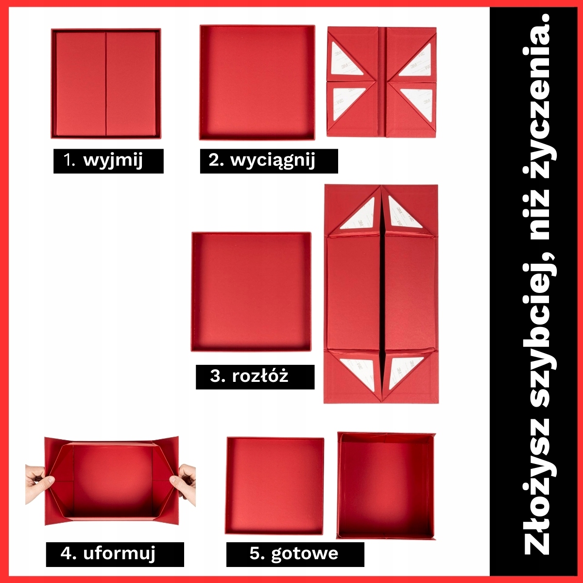 Pudełka z serii EasyBox złożysz szybciej, niż życzenia! Jak to możliwe? Konstrukcja składanych pudełek, jest gotowa do użycia już w chwili otwarcia opakowania. Wystarczy rozłożyć pudełko, odkleić taśmy i złożyć. Całość zajmie jedynie 30 sekund!
