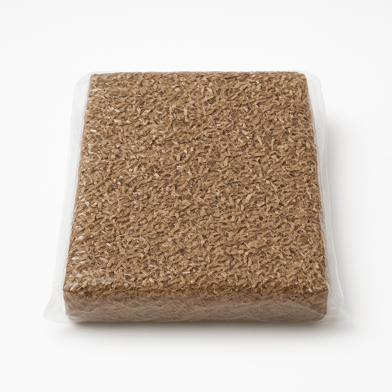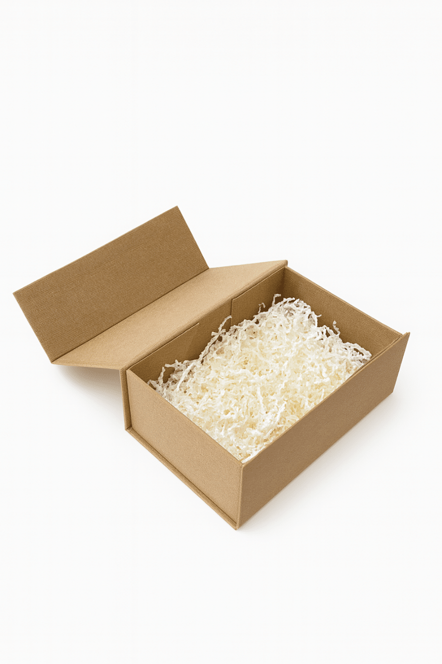 Wypełniacz po otwarciu szybko nabiera objętości i tworzy lekką, równomierną warstwę, która dobrze układa się w pudełkach i utrzymuje swój kształt podczas transportu. Naturalna, drobna harmonijka sprawia, że materiał jest wydajny, łatwy w formowaniu i estetyczny w prezentacji – szczególnie w zestawach, w których liczy się czystość wykonania i eleganckie wykończenie wnętrza opakowania.